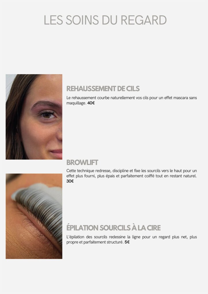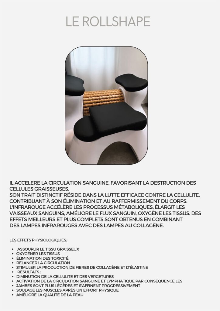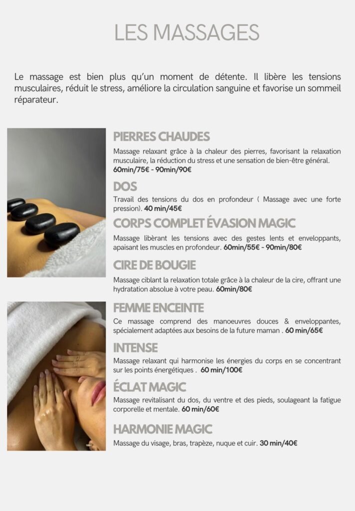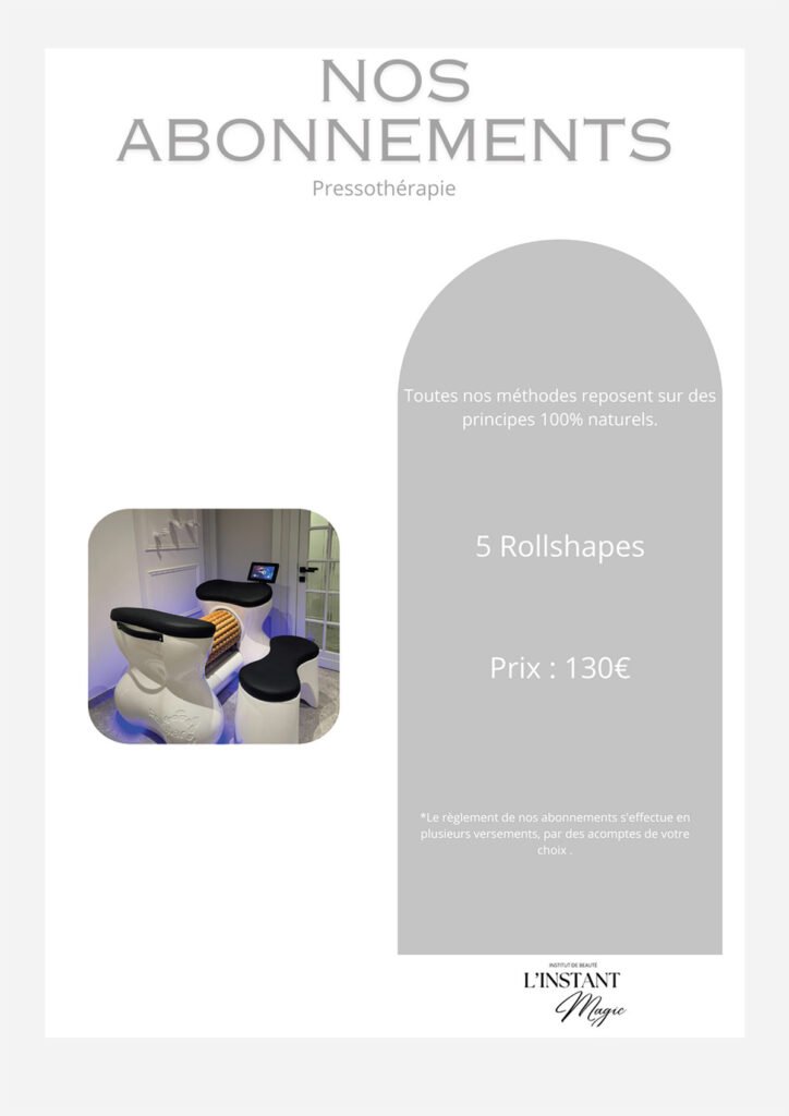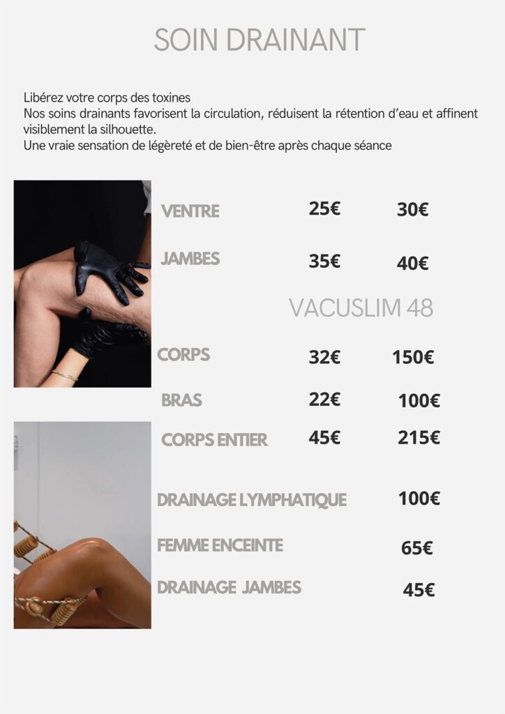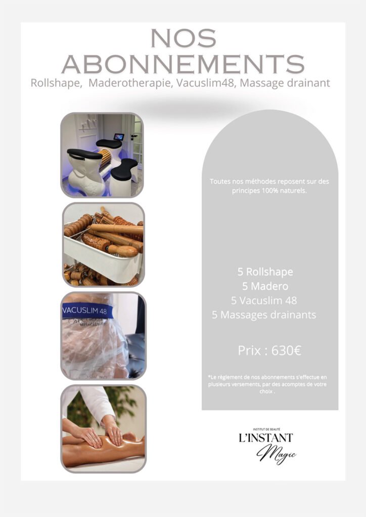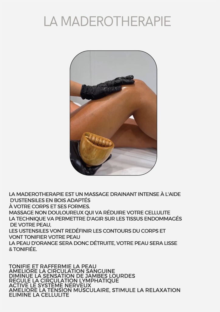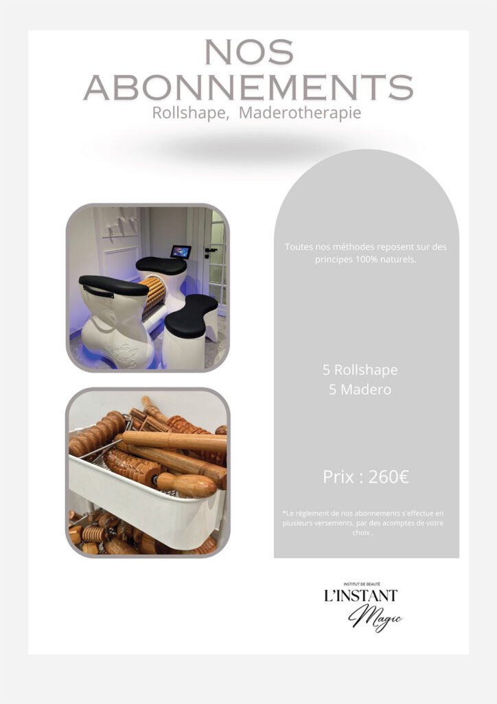 Nous proposons une gamme complète de soins, incluant soins du visage, extensions de cils, spray tan, massages, madérothérapie, pédicure, épilation définitive, pressothérapie, et Roll Shape.