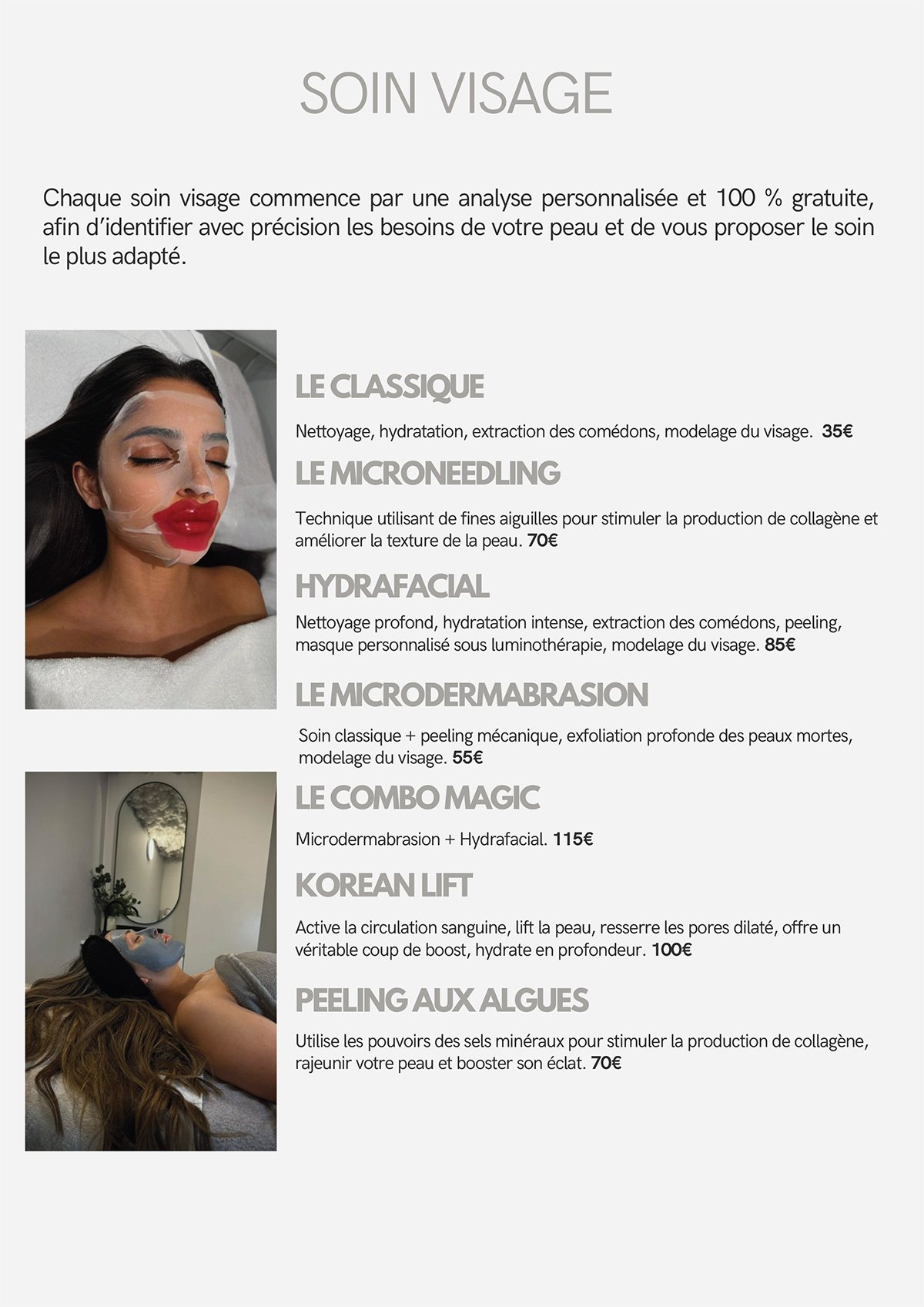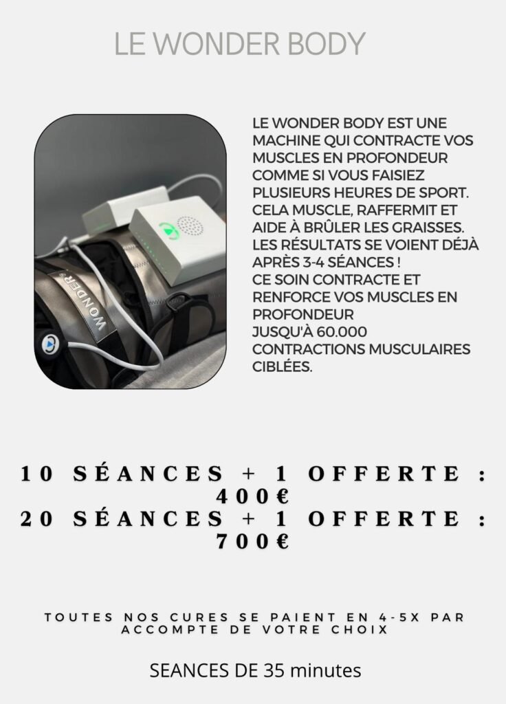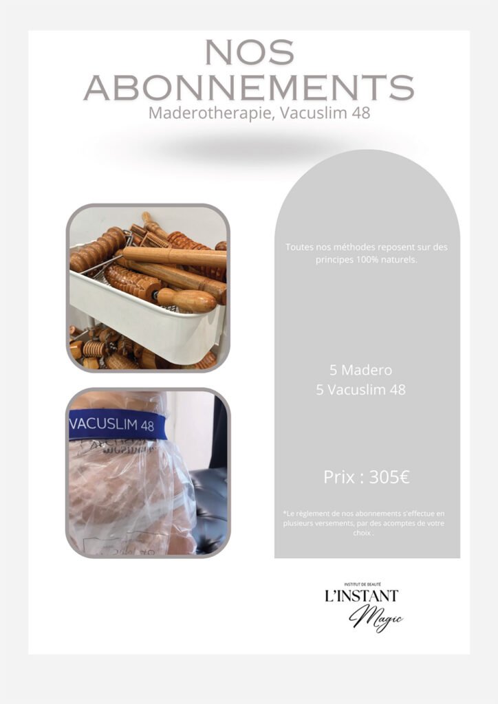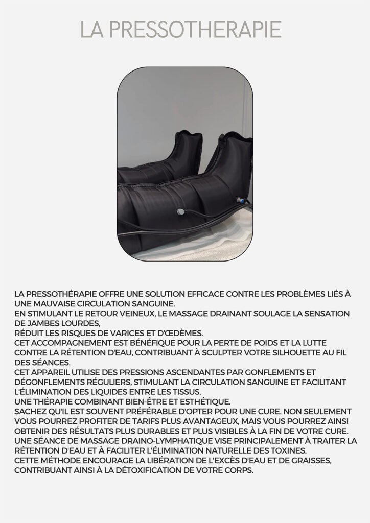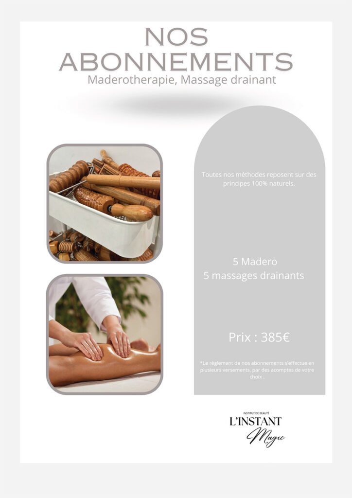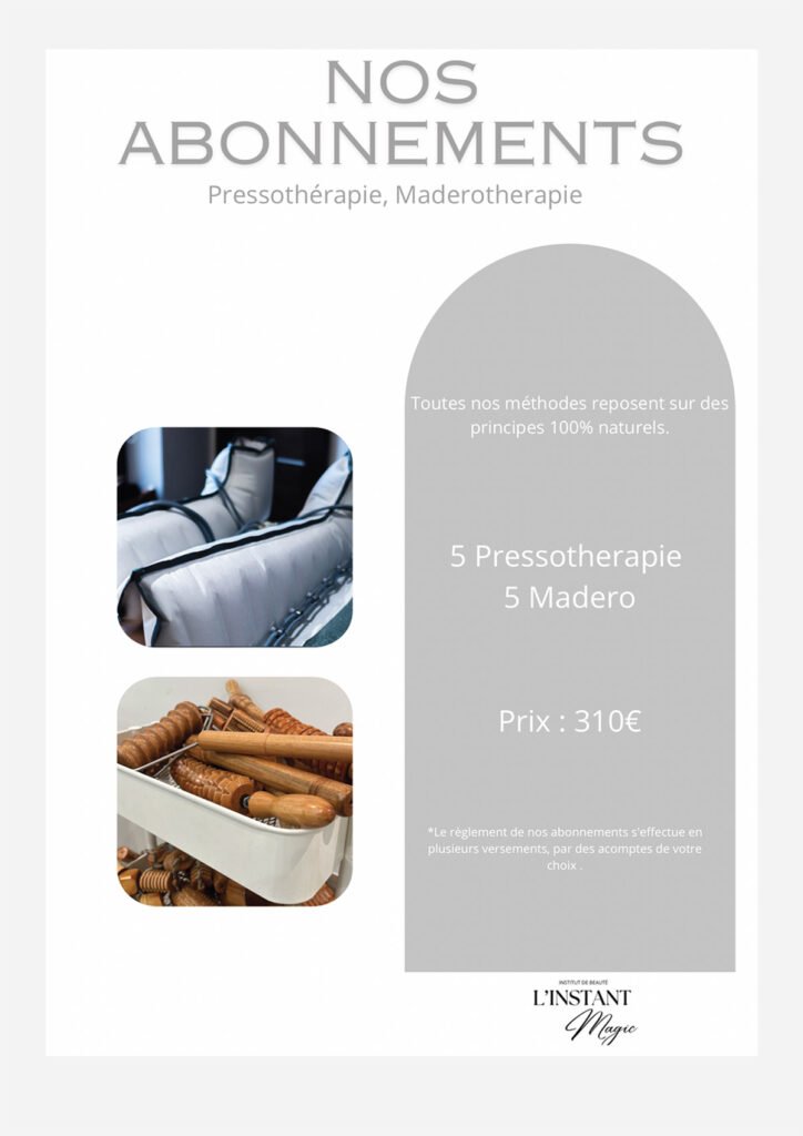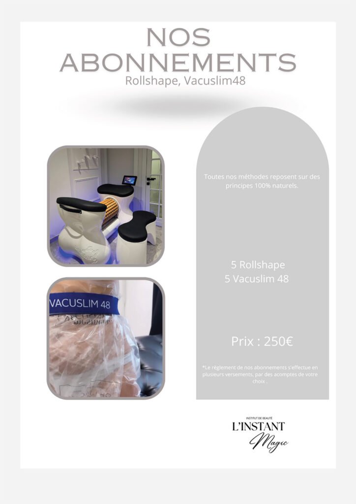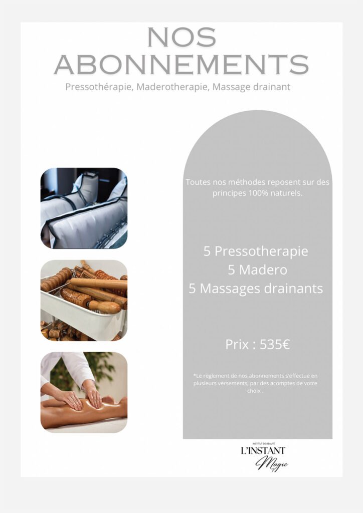 Nous proposons une gamme complète de soins, incluant soins du visage, extensions de cils, spray tan, massages, madérothérapie, pédicure, épilation définitive, pressothérapie, et Roll Shape.